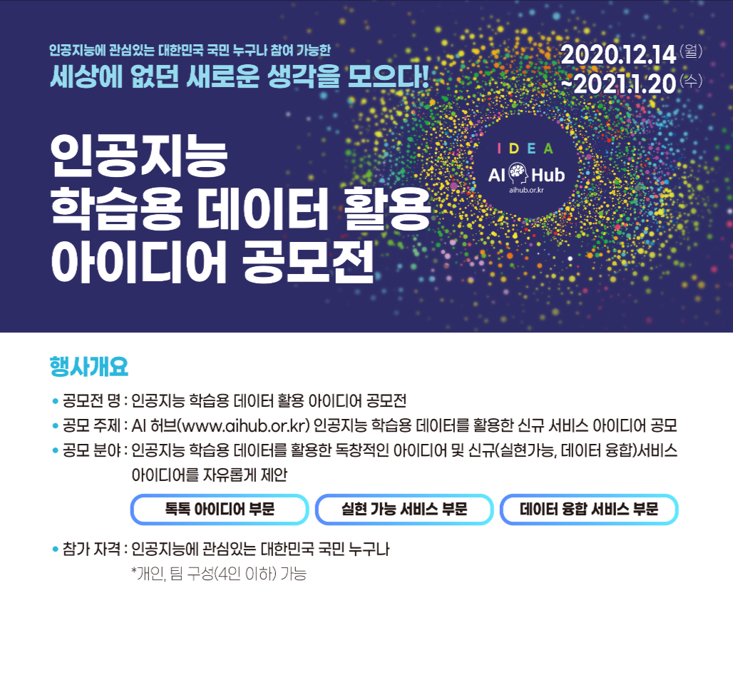 AI 허브(www.aihub.or.kr)에서 인공지능 학습용 데이터를 활용한 신규 서비스 아이디어를 공모합니다.