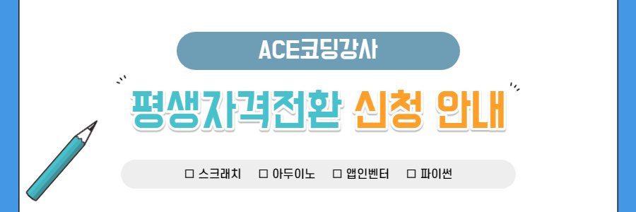 2021년도 제7회 ACE코딩강사 자격증을 취득하신 분들을 위한 평생자격 전환 신청을 다음과 같이 안내 드립니다. 아래사항 확인하셔서 접수기간 내에 평생자격 전환 신청을 해주시기 바랍니다.