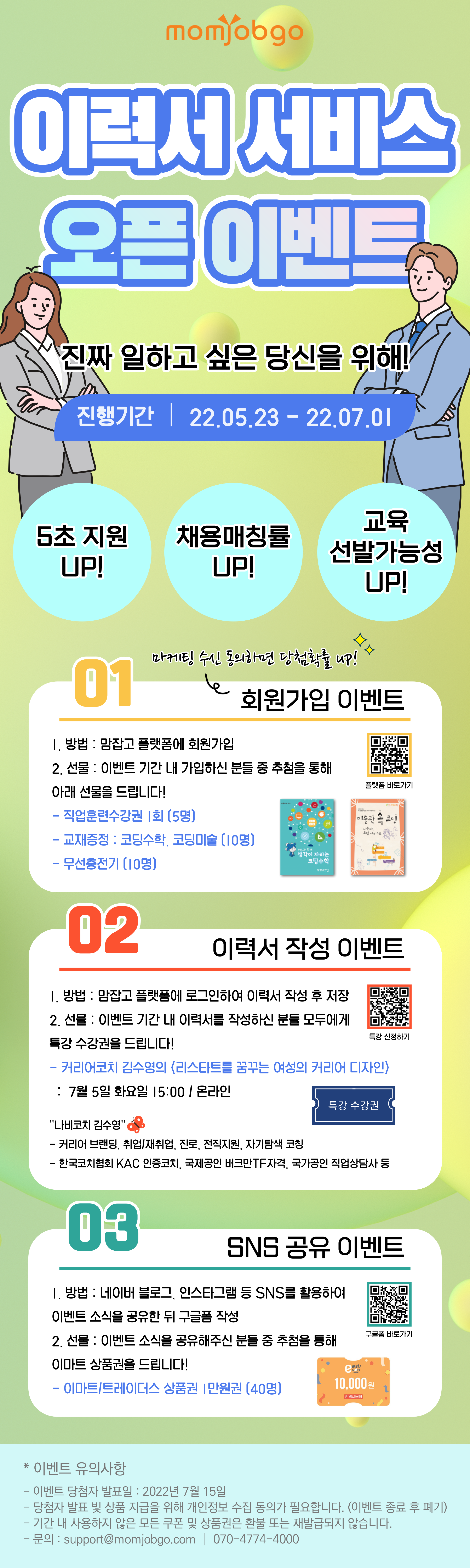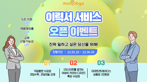 맘잡고의 이력서 서비스 오픈 이벤트 소식을 널리 퍼뜨려주세요.