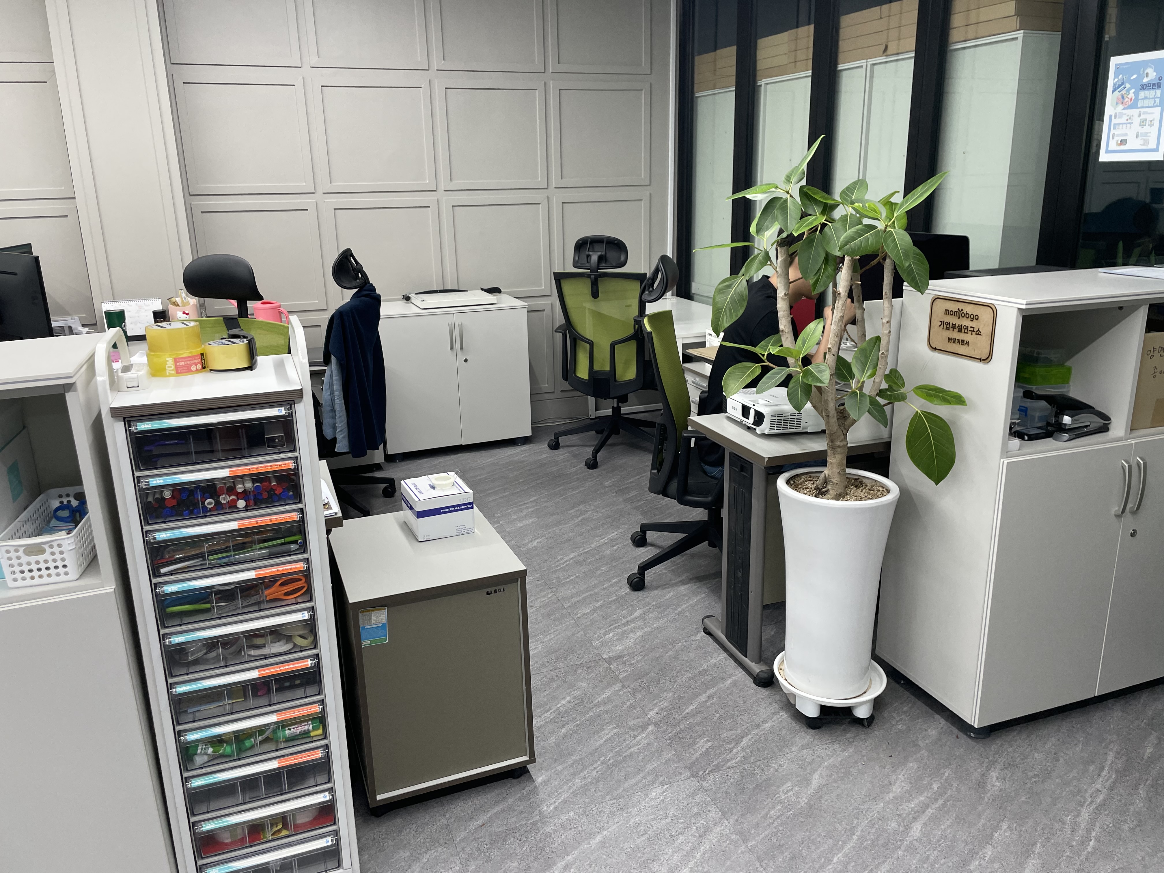 맘이랜서는 과반수 이상이 재택근무자이기 때문에 사무실 출근을 필요로 하는 날에는 공유 오피스를 사용하고 있습니다.