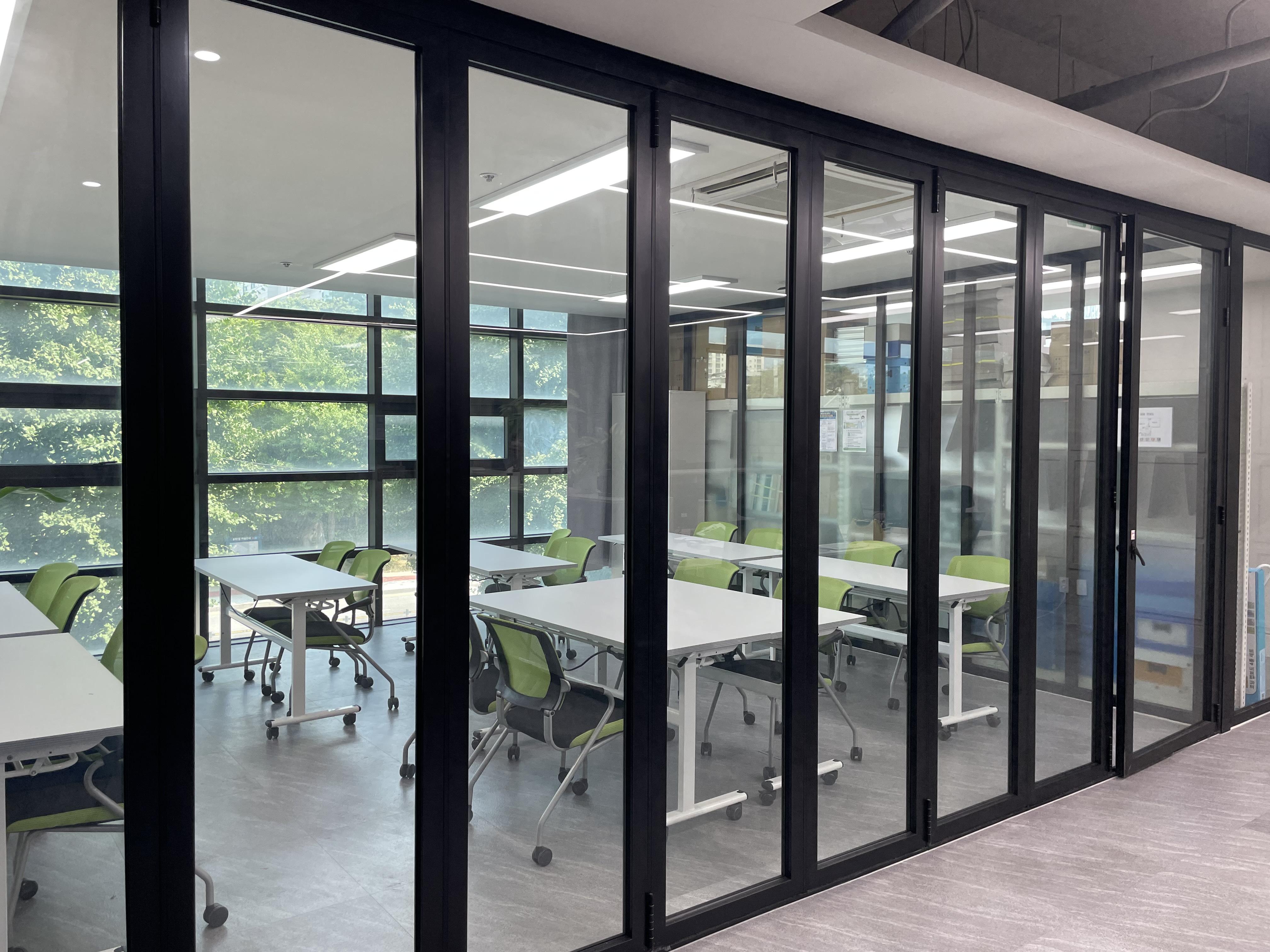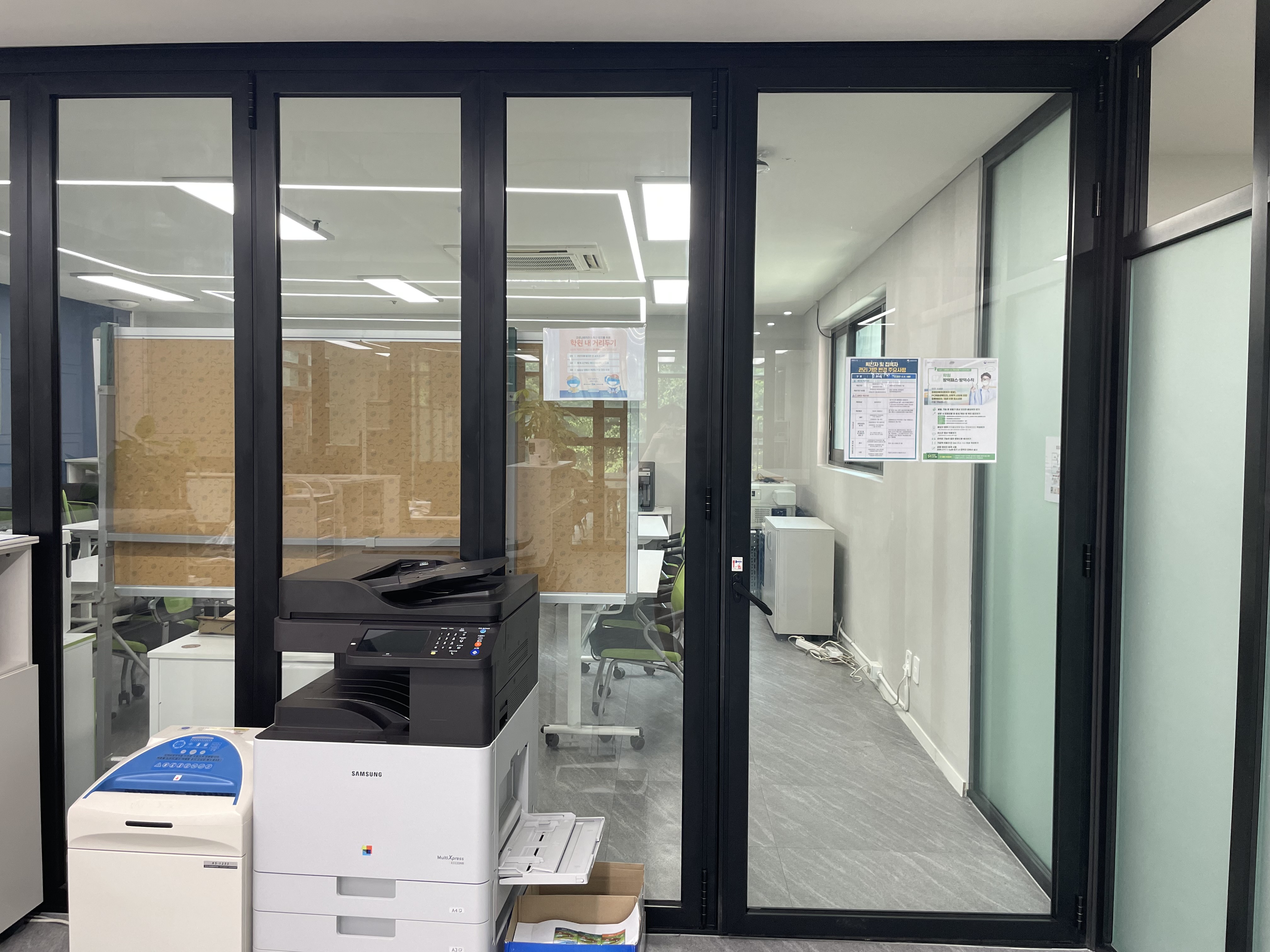 사무실 왼쪽 공간이 바로 강의실1입니다. 바깥으로 보이는 파릇파릇한 광경이 이전 대교육장을 떠올리게 하네요.