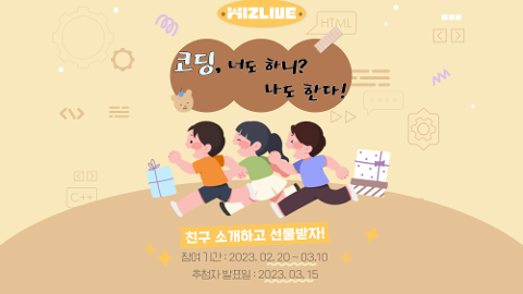 (주)맘이랜서에서 온라인 1:1 화상 코딩교육 위즈라이브 서비스를 진행하게 된 기념으로 친구초대 이벤트를 진행합니다.