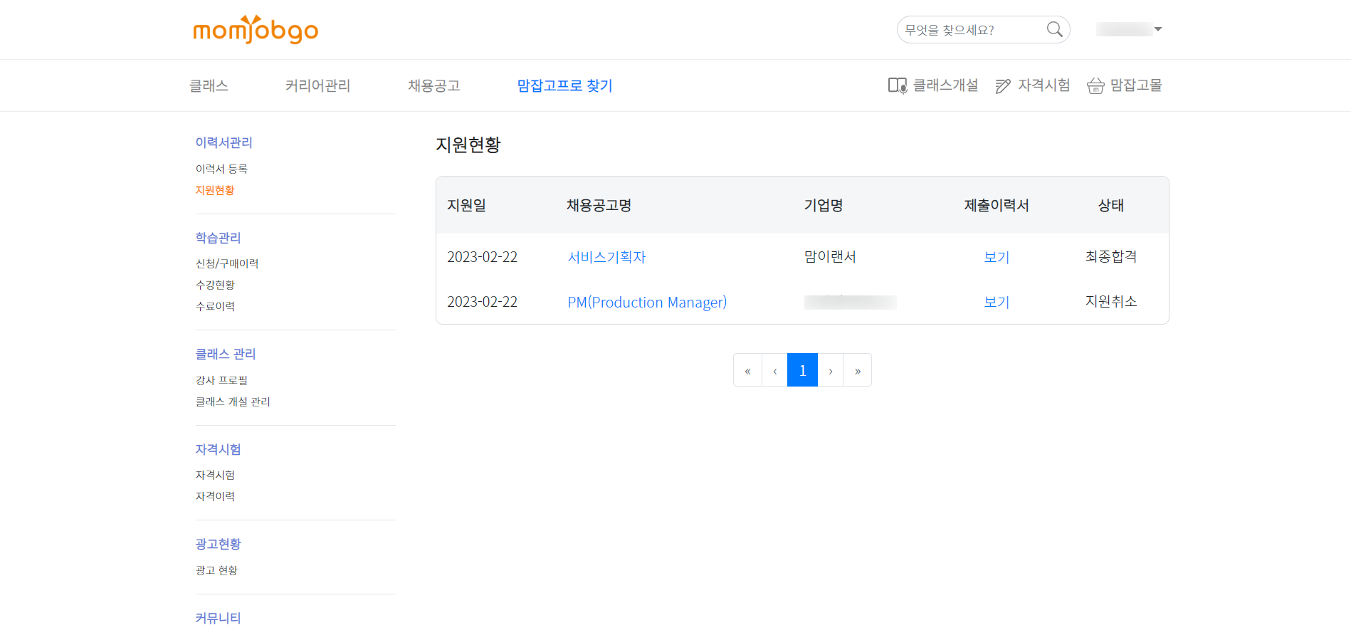 메뉴에서는 지원현황을 확인하실 수 있습니다.