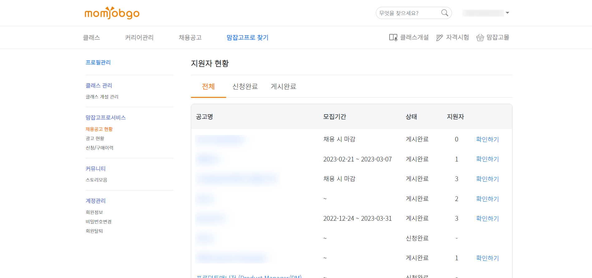 공고명을 클릭하면 해당 공고로 이동하며, 확인하기 버튼을 눌러 공고별 지원자를 확인할 수 있습니다.