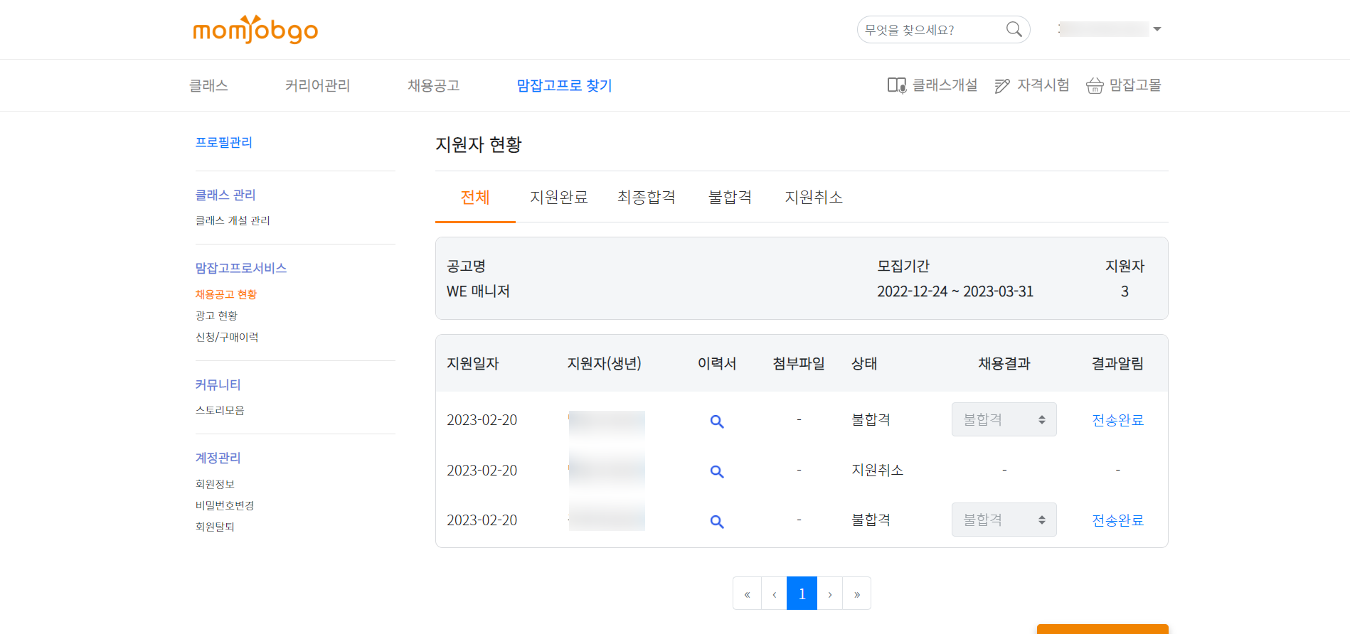 기업회원은 채용공고 현황에서 지원자를 확인하고 결과 알림을 보낼 수 있습니다.