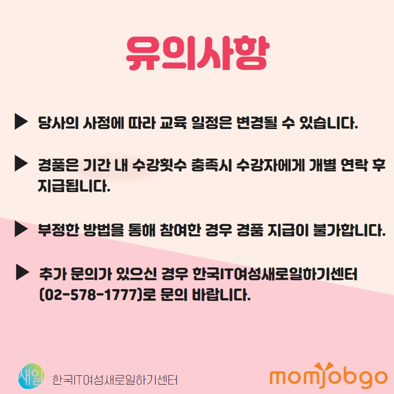 추가 문의가 있으신 경우 한국IT여성새로일하기센터(02-578-1777)로 문의바랍니다.