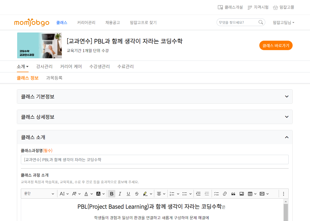 가장 크게 변한 부분은 ‘클래스 정보’ 메뉴로, 화면 한 켠에 세로로 길게 보여져 작성에 어려움이 있었던 클래스 소개를 좀 더 쉽게 수정하실 수 있습니다.