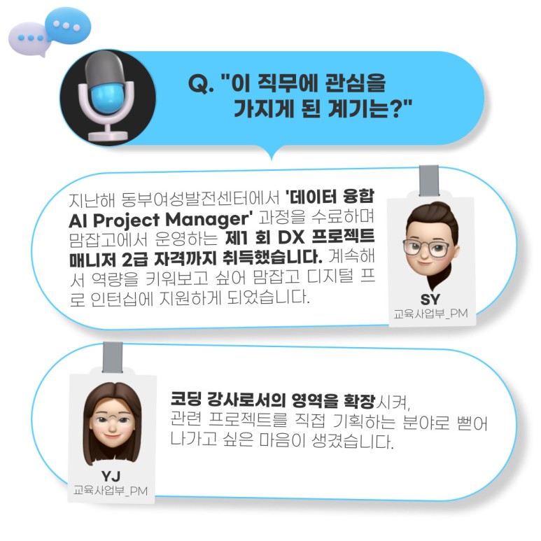 코딩 강사로서의 영역을 확장시켜, 관련 프로젝트를 기획하는 분야로 뻗어나가고 싶은 마음에 지원했습니다./ YJ
