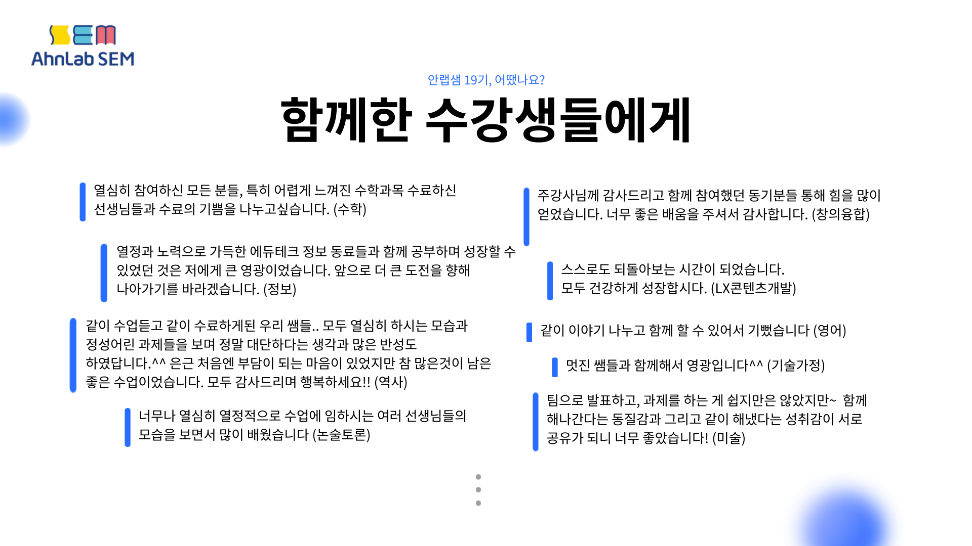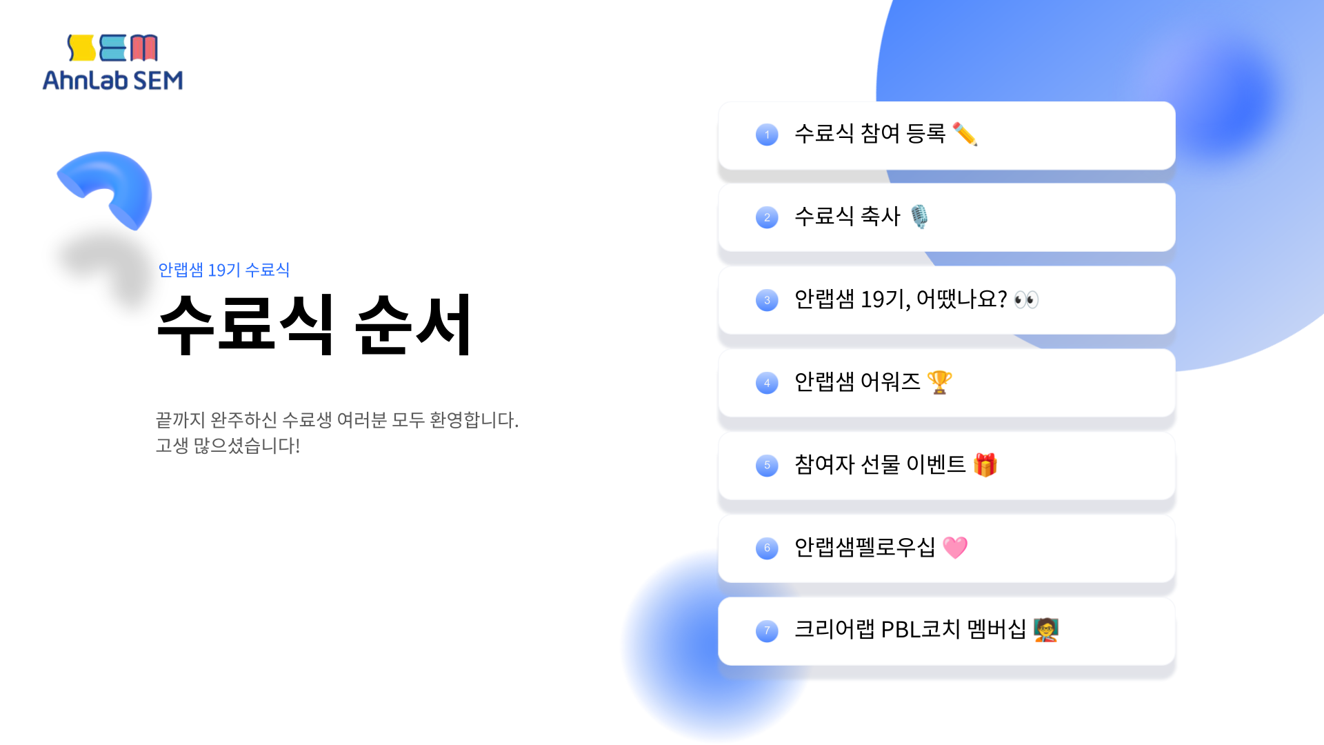 안랩샘이 짧은 기간에 비해 쉬운 과정은 아닌데 많은 수료생을 배출할 수 있어 감사한 마음입니다. 🫶
