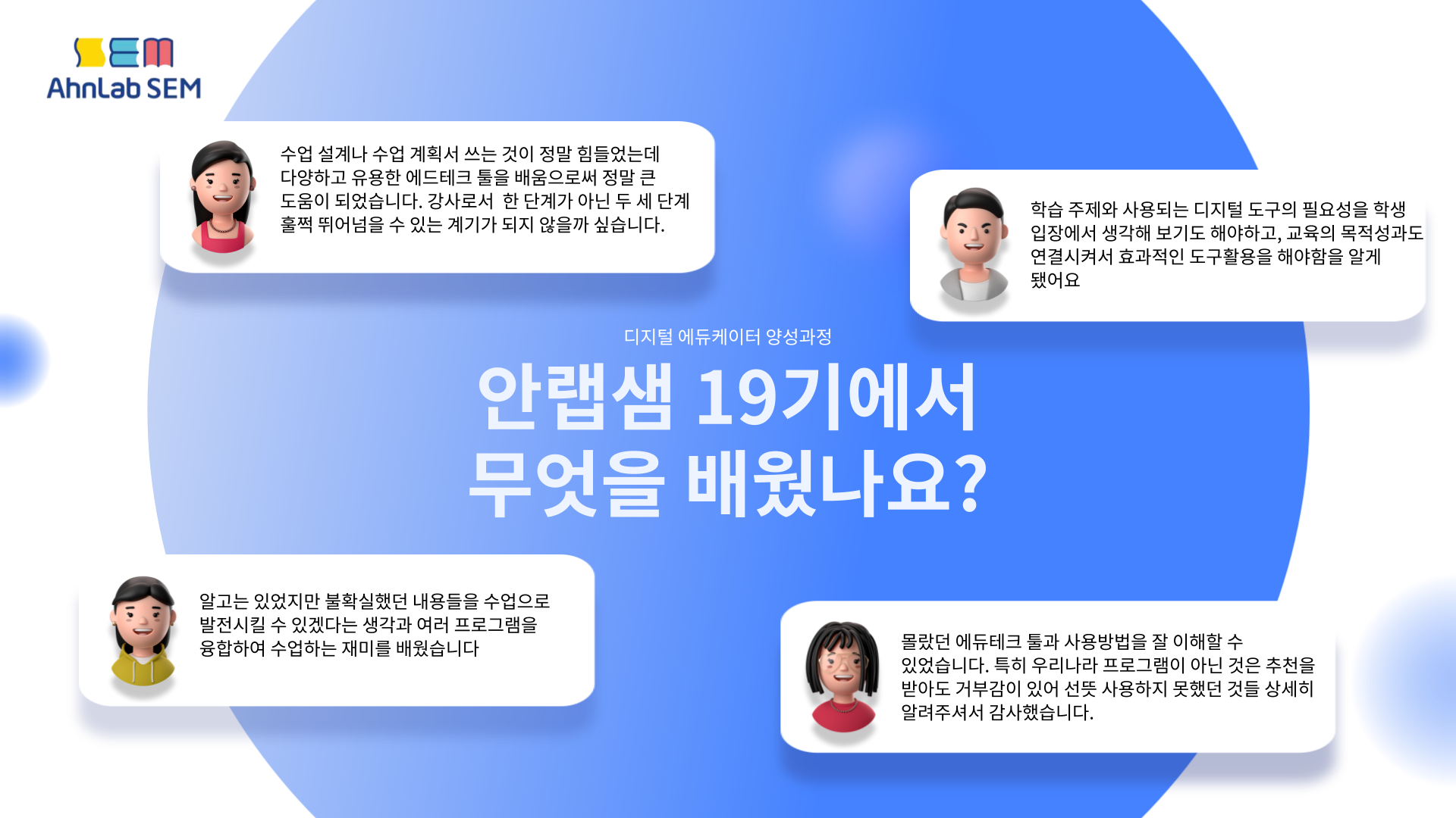 이번에는 19기에는 AI 디지털 교과서에 대한 높은 관심으로 강사 및 교사 분들이 디지털 에듀케이터 양성과정을 많이 신청해주셨습니다.