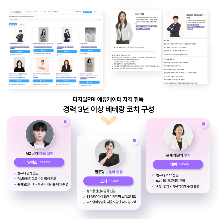 크리어랩 코치진은 최소 3년 이상의 경력 이상의 PBL에듀케이터 자격 보유자로 정기 연수와 서로 평가를 통해 더 나은 교육을 위해 끊임 없이 노력합니다.