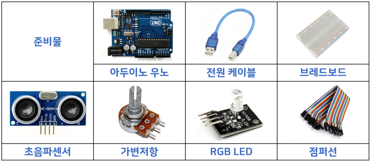 * 수업 준비물 == 아두이노 우노, 전원 케이블, 브레드보드, 초음파센서, 가변저항, RGB LED, 점퍼선 (아래 준비물 이미지 참조!!)