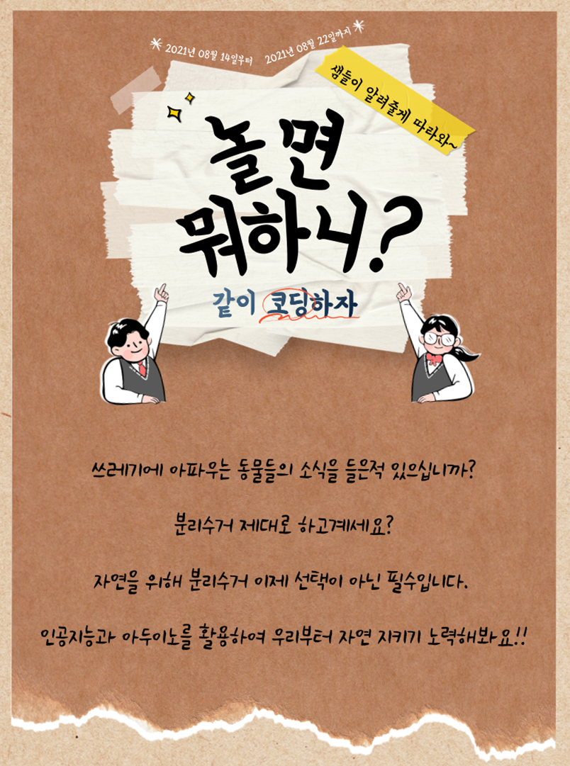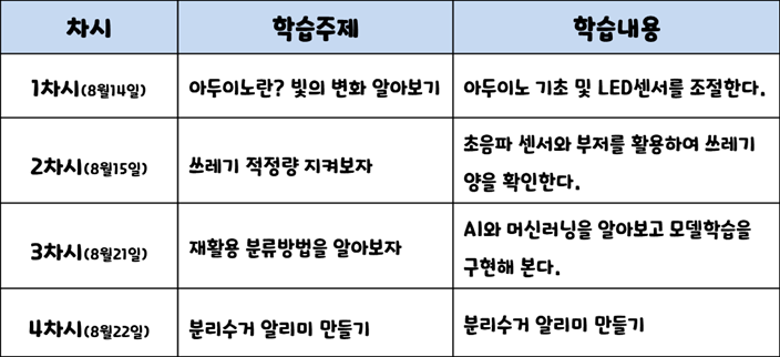 환경 문제와 해결책에 대한 관심을 갖고 아두이노 센서와 인공지능을 융합하여 쓰레기 분리수거 알리미를 구현한다.