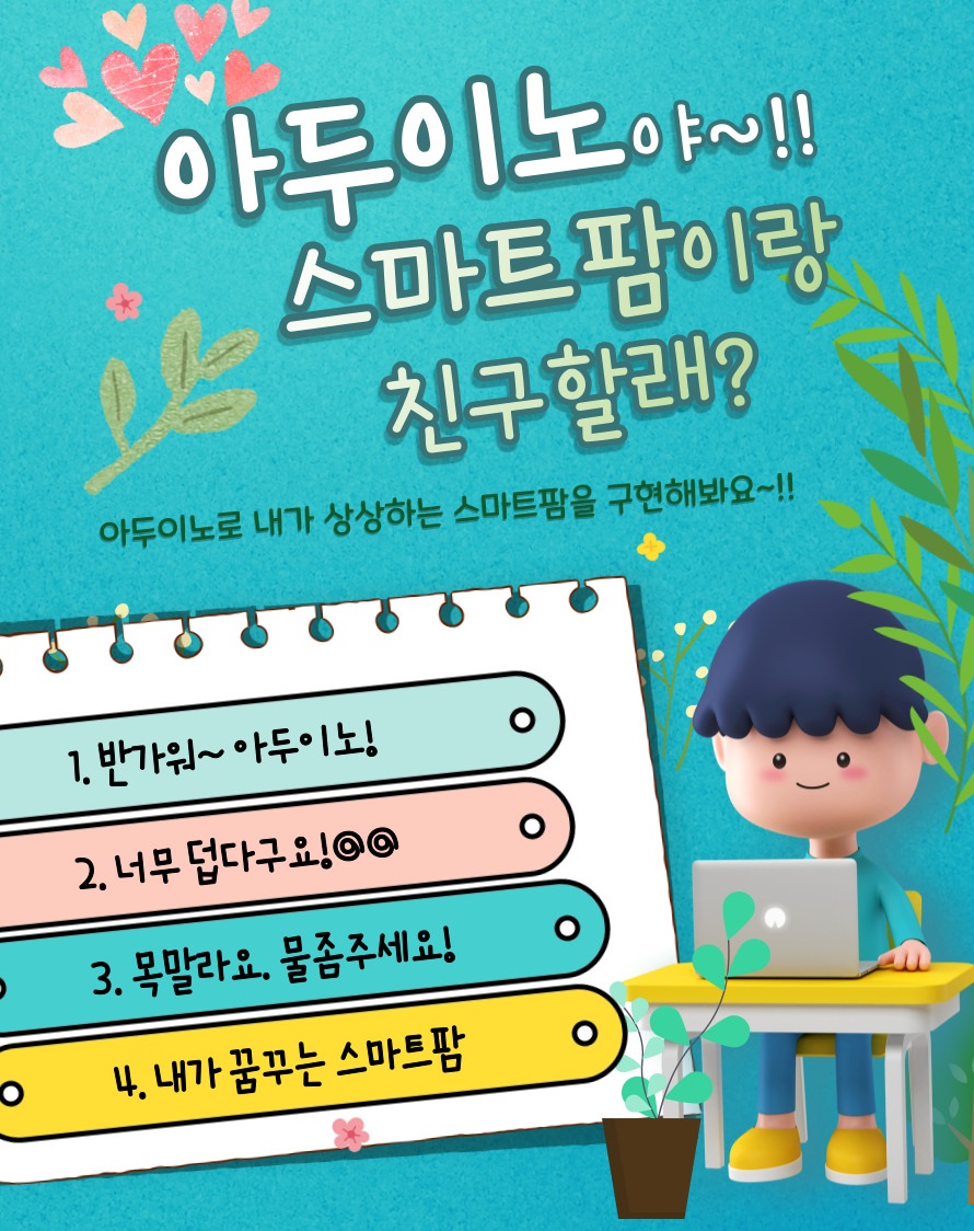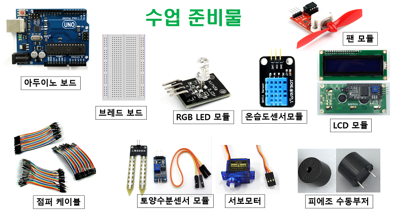 - 수업준비물 : 아두이노 보드, 점퍼케이블, 브레드보드, RGB LED 모듈, 온습도센서모듈, 팬모듈, LCD모듈, 토양수분센서, 서보모터, 수동부저