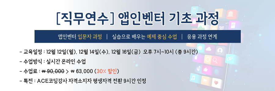 ▷ 앱인벤터를 처음 배우는 분들을 위한 수업으로 기초부터 진행되는 수업입니다. 앱인벤터를 학습한 경험이 있으신 분들은 응용과정이 별도로 오픈되어 있으니 참고해주세요. <응용과정 보기>