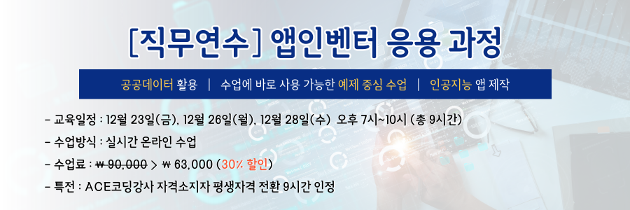 앱인벤터 응용 과정으로 인공지능, 공공데이터를 활용한 앱을 만들어 보는 과정입니다. .