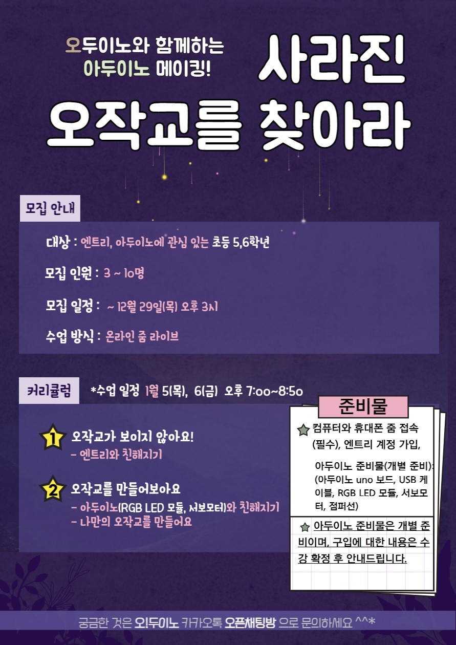 ✔︎ 실시간 온라인 학습 💻 ✔︎ 준비물: 노트북 또는 PC, 아두이노, RGB 모듈, 서보모터센서, 브레드보드, 점퍼선, 견우직녀이미지 또는 꾸미기재료 <<주의사항 - USB A연결 포트 유무 확인 필수!>> |