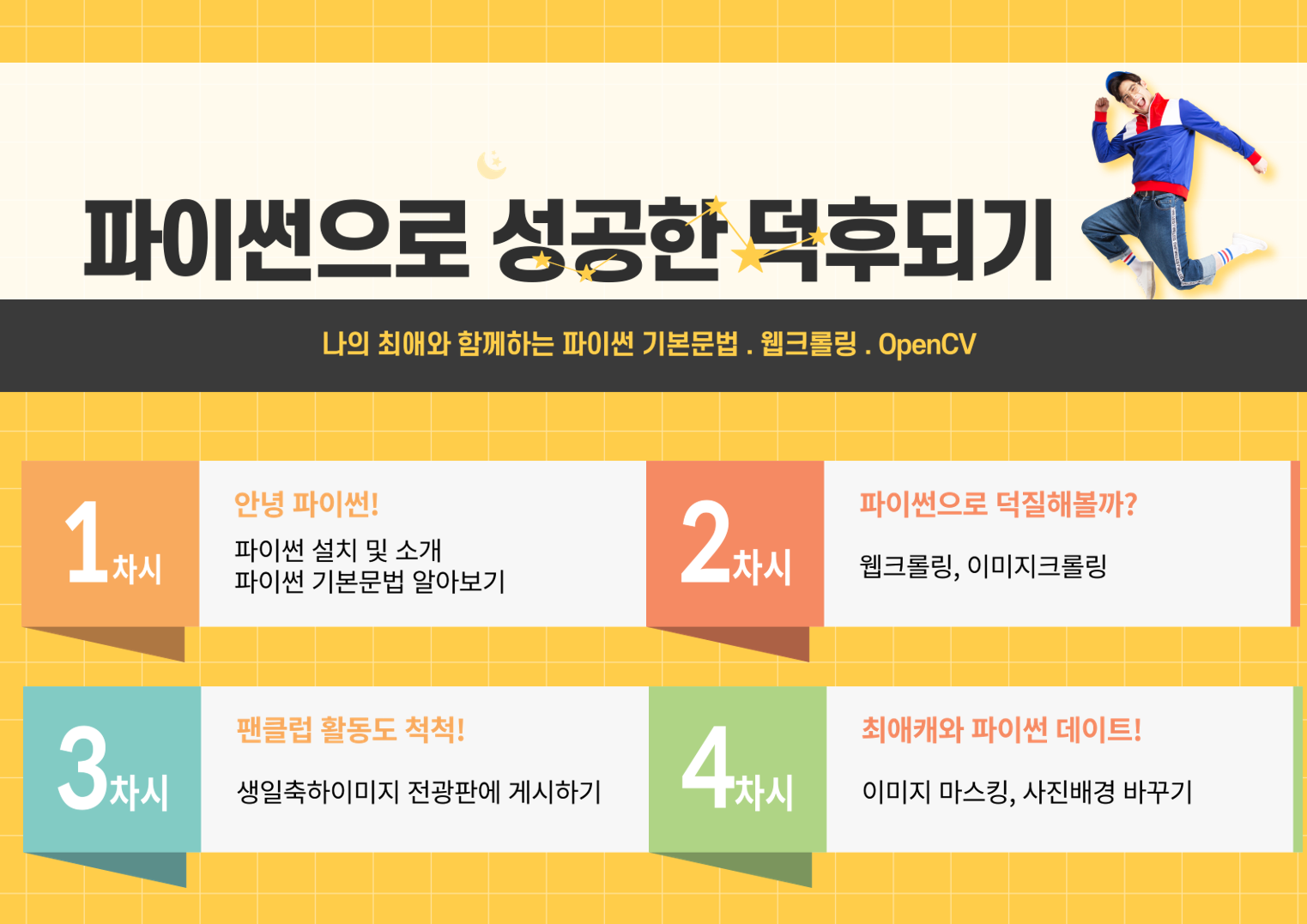 | 2차시 | 2/21(화) 10:20 ~ 12:00 | 파이썬으로 덕질해볼까? | 웹크롤링, 이미지크롤링 |