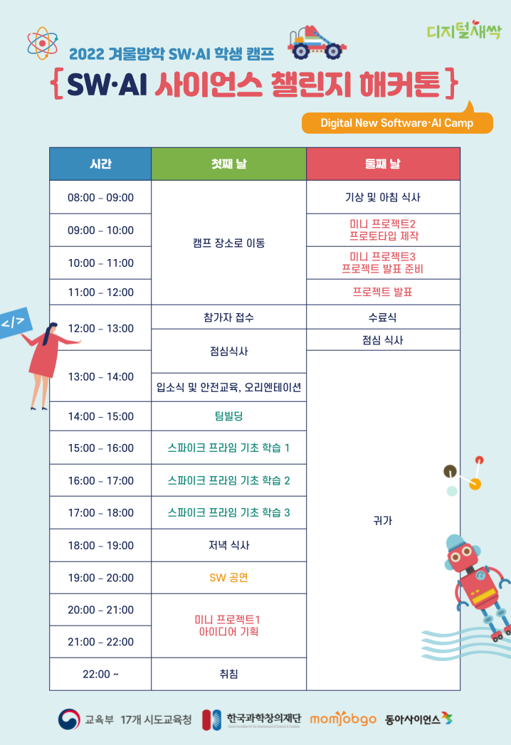 <SW·AI 사이언스 챌린지 해커톤>은 디지털 새싹 캠프의 일환으로, ‘해커톤’ 형태로 SW·AI 에 대한 집중적인 학습을 진행하고 또래 친구와 협업을 통해 짧은 기간 동안 결과물을 만들어 냄으로써 SW·AI 분야에 대한 자신감과 성취감을 얻을 수 있는 1박 2일 숙박형 캠프입니다.
