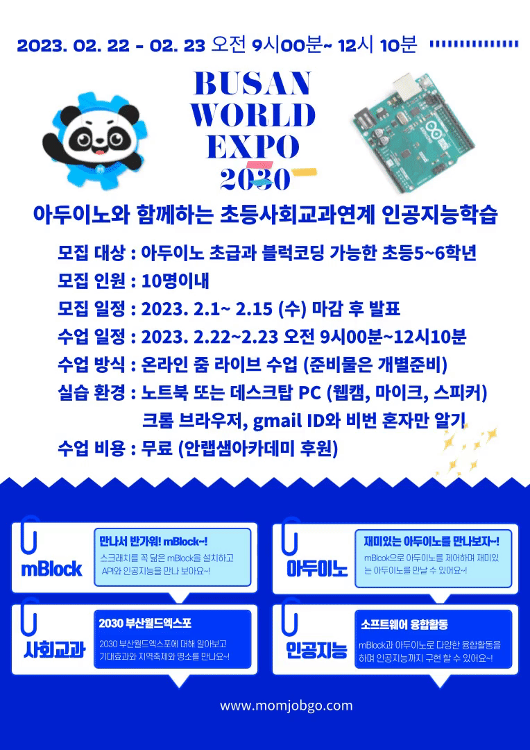 - 2030 부산월드엑스포의 개최 유치를 기대하며 초등사회 교과과정인 ‘지역축제’ 와 관련하여 우리나라의 지역축제와 명소도 알아보고 내가 사는 명소를 블럭코딩으로 API와 인공지능을 만나고 아두이노를 제어하는 활동 수업을 통해 소프트웨어의 기초와 전자회로의 원리를 만나 볼 수 있습니다.