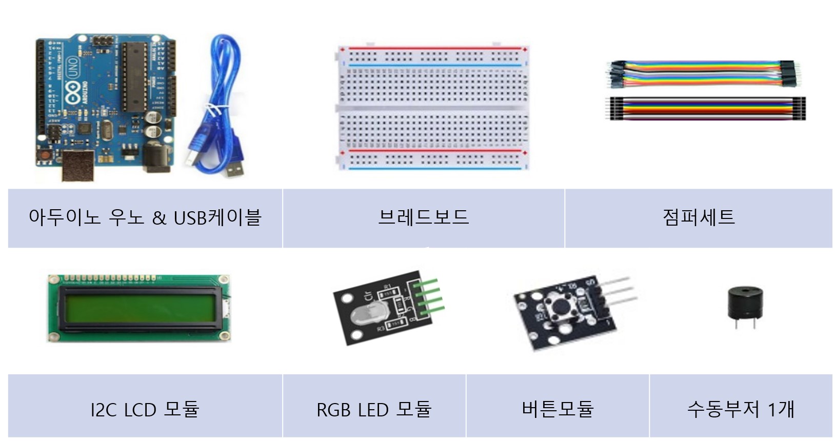 아두이노(우노) & USB케이블, 브레드보드, 수수암수점퍼세트, RGB LED 모듈, LCD 모듈(LCD모듈 뒷편의 크기의 십자드라이버),버튼모듈, 피에조 수동부저