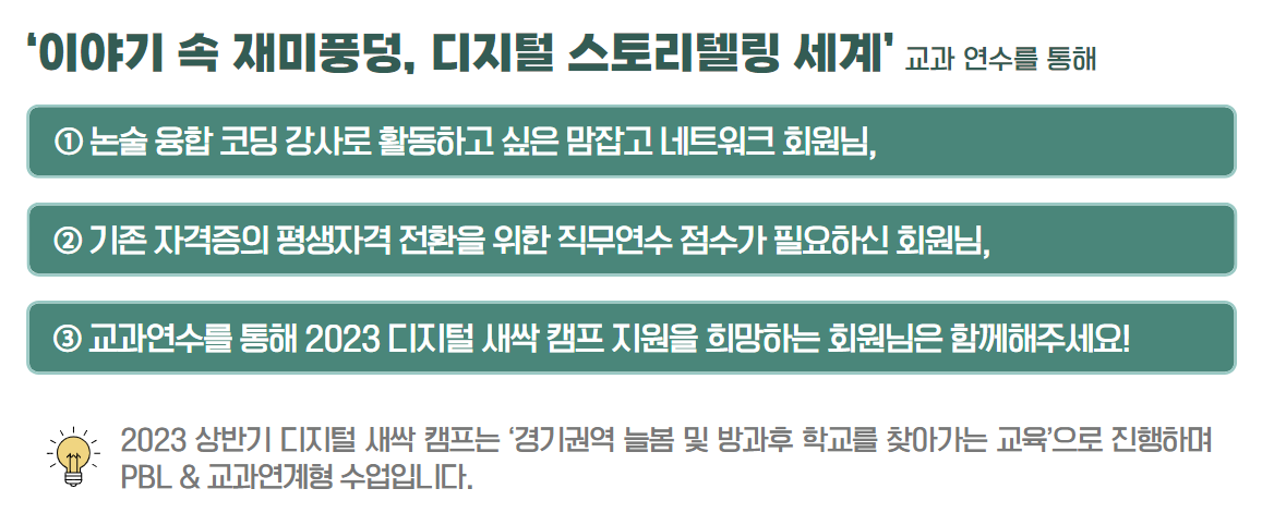 - 맘잡고 자격 보유 회원 (ACE코딩강사, PBL퍼실리테이터) 중 평생자격전환에 필요한 직무연수 시수가 필요한 분 우대