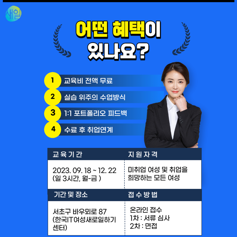 ▶ 교육장소 : 서초구 바우뫼로 87 (한국IT여성새로일하기센터) /온라인,오프라인 병행 수업
