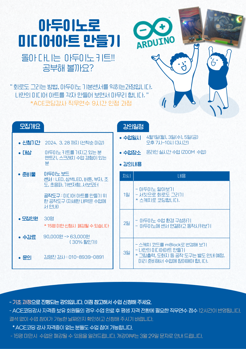 ▷ 준비물 : 아두이노 보드, 센서, 공작도구, 온라인수업이 가능한 환경 (웹캠, 마이크)