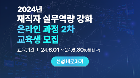 - 홈페이지 상단 ‘교육’ > ‘온라인교육’ > ‘2024년 재직자 실무역량 강화를 위한 온라인 과정 2차’ 신청