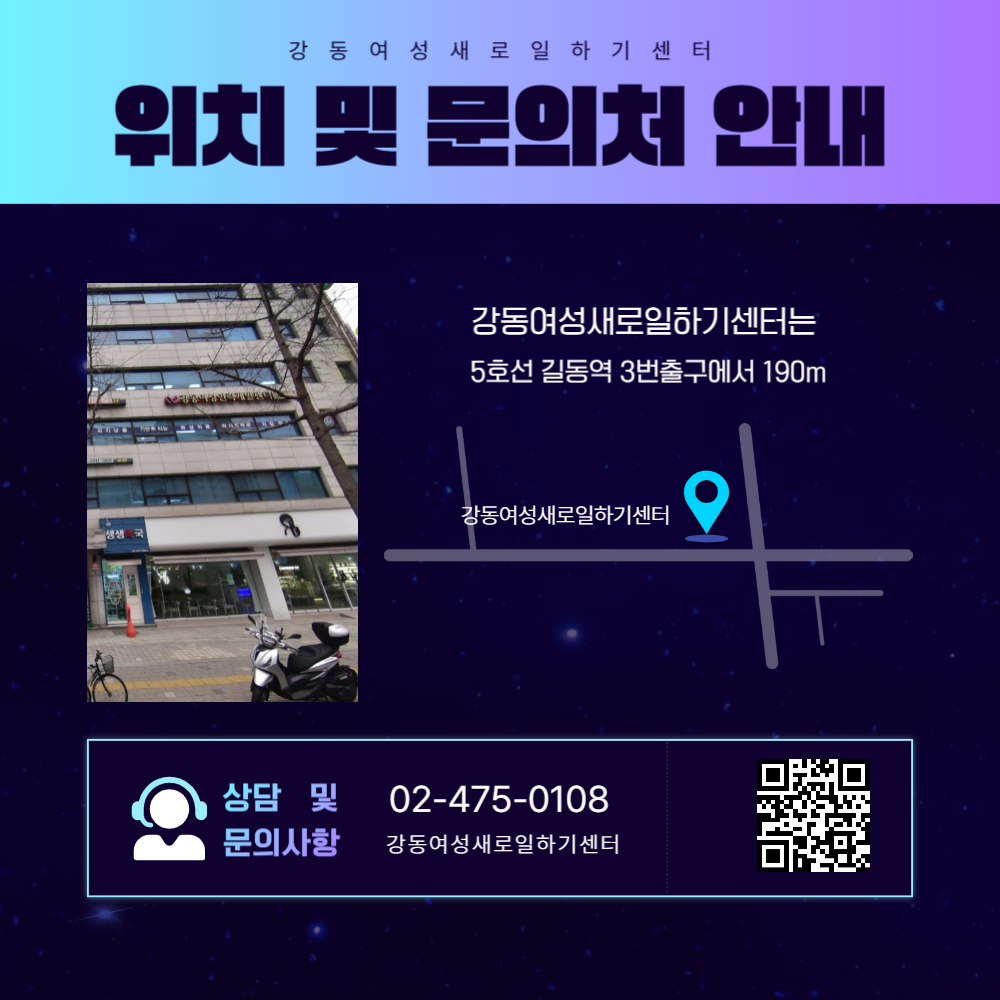 ※ 방문접수시 전화 후 방문- 서울시 강동구 양재대로 1458, 5층 강동여성인력개발센터(강동여성새로일하기센터) (5호선 길동역 3번출구, 도보300m직진 길동농협5층)