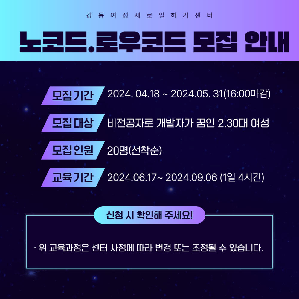 ○ 교육기간 : 2024. 6. 17. ~ 2024. 9. 6. (1일 4시간 / 09:30 ~ 13:30)