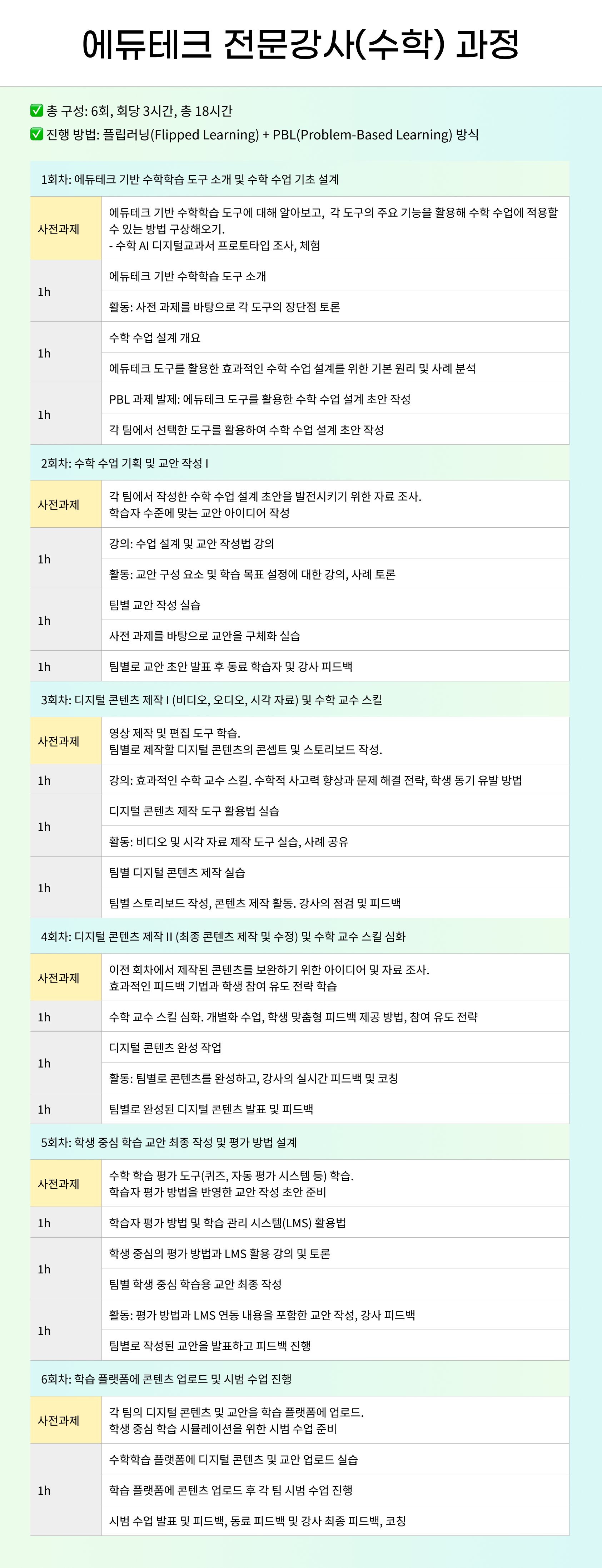 • 교육 방식 : 플립러닝(Flipped Learning) + PBL(Problem-Based Learning) 방식