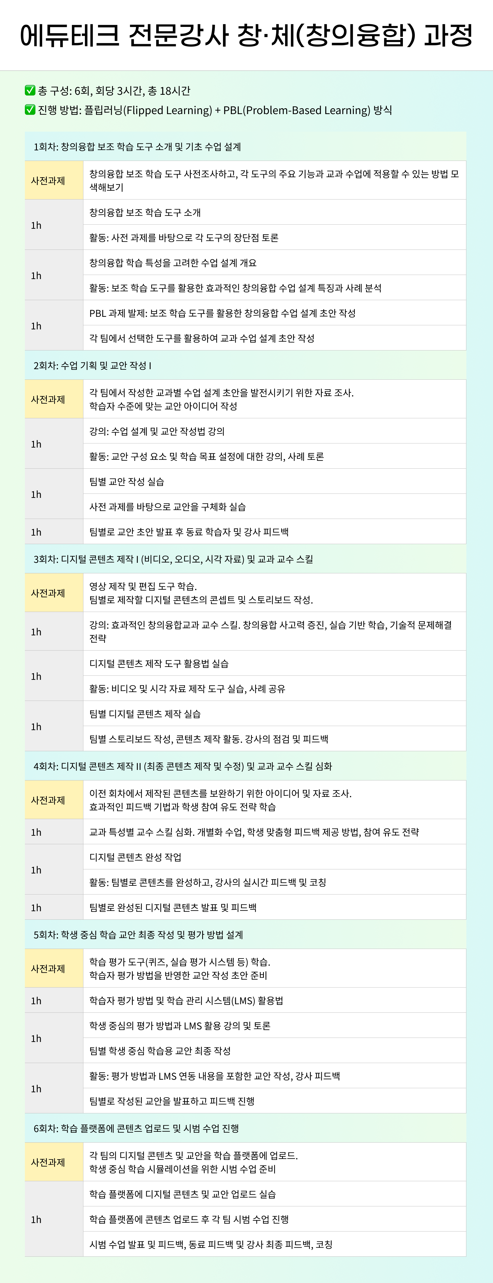 • 교육 방식 : 플립러닝(Flipped Learning) + PBL(Problem-Based Learning) 방식