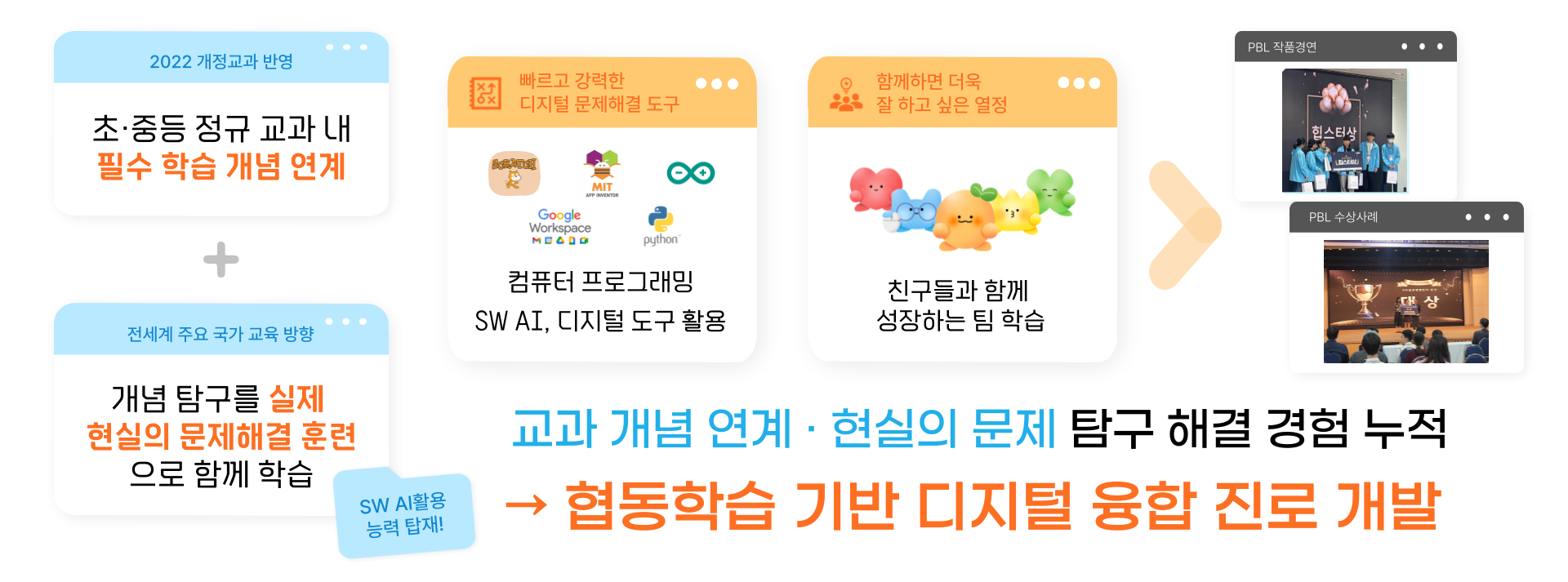 • 문제중심학습(Problem-Based Learning) 실제 문제를 중심으로 학습하며, 학생들이 문제를 정의하고 해결하는 과정을 주도적으로 경험합니다.