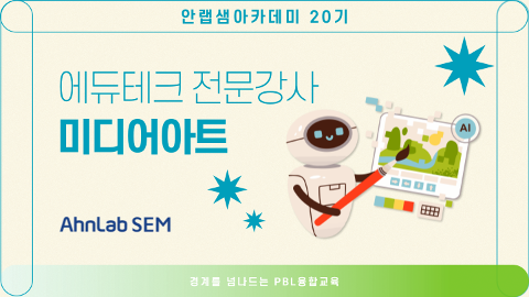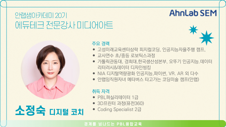 글로벌 통합보안기업 (주)안랩의 12년차 사회공헌 프로젝트 [안랩샘아카데미] 20기를 시작합니다. 일하고 싶고, 일할 능력이 있는 청년, 여성을 위한 지속 가능한 에듀테크 직업 설계와 개발! 초중등 학생들의 필수 교육과목으로 자리잡은 데이터 기반 문제해결에 대한 교수학습 과목을 학습하세요. 수료 후에는 자신의 대표 교과목으로 장착한 후, 성공적인 교육 커리어를 개척하고 교육현장 리더가 될 수 있도록 기반을 제공해 드립니다.