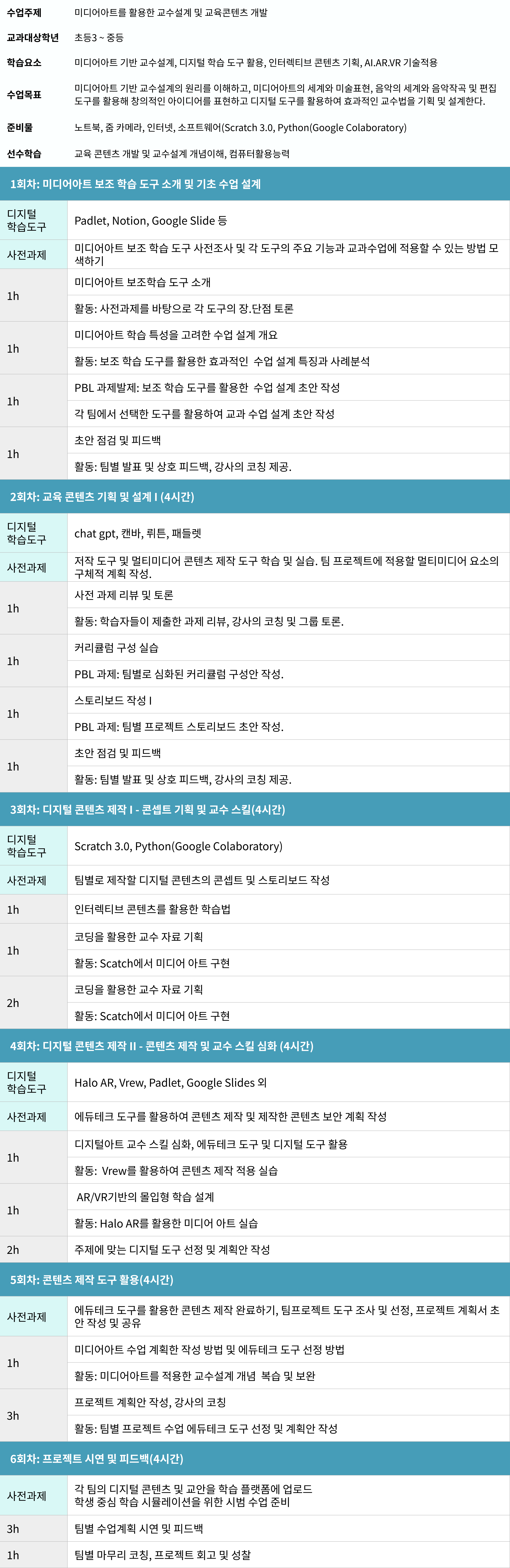 수업 : 매주 목요일 09:00 ~ 13:00 (주 1회 4시간, 총 6회)