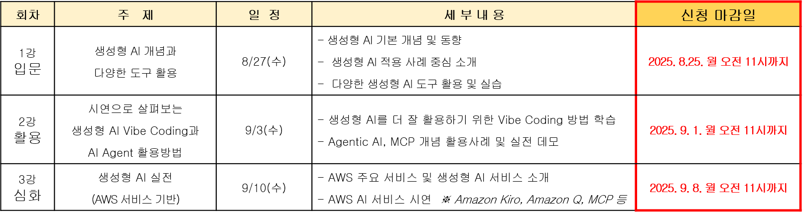 - 일시: 2025.08.27. ~ 09.10. 매주 수요일 15:00-17:00 (2H / 총 3강, 6H)